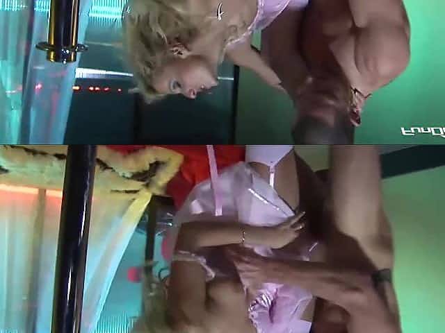 Voluptuous golden-haired schlong teaser is having sex with a ebony man, in front of her partner