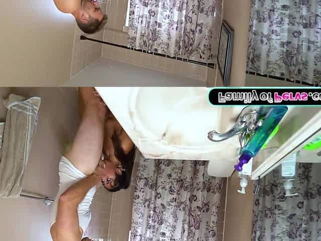 My stepsister looks at me while on her knees sucking my dick