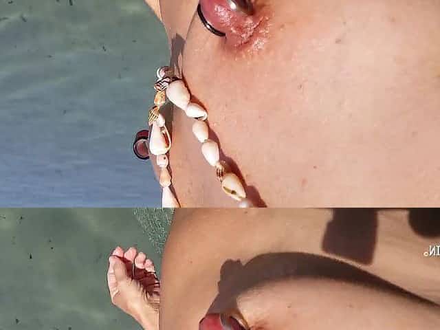 nippleringlover undressed beach tunnels in pierced teats stretching pierced cunt wide open for peeing