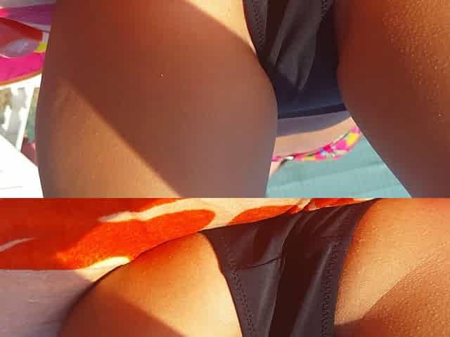Gf opens legs shows pussy lines, ass at pool, bikini slip