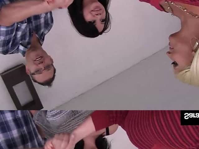 One guy fucks the shit out of two horny girls in 3way orgy.