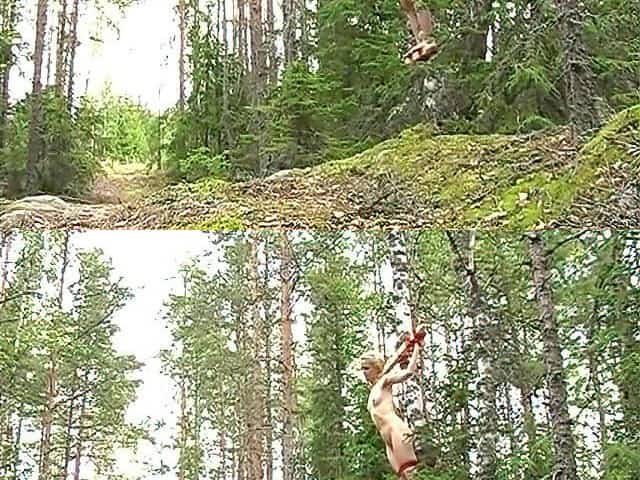 Naked self-bondage in the woods gone wrong.