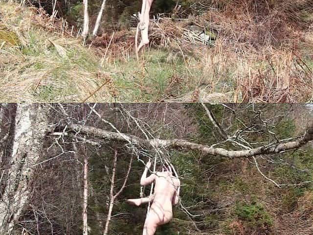 Naked self-bondage in the woods gone wrong.