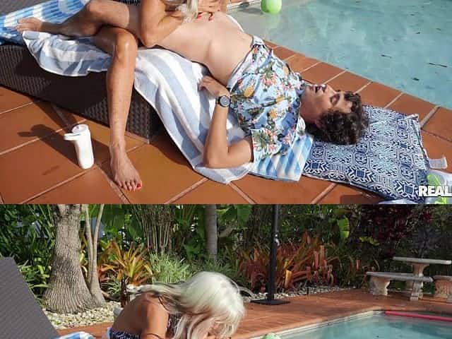Busty mature pornstar gets her cunt fucked by the outdoors pool