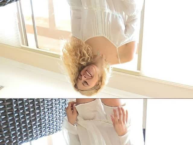 Beautiful towheaded with blue eyes is about to take off her neon swimsuit and fap a bit
