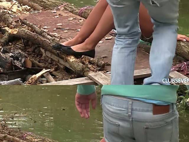Two dudes share one sweet looking teen Naomi Bennet in the forest