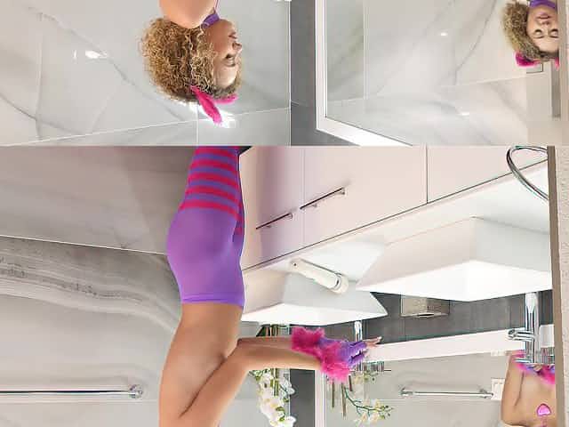 Freakish brunette changes her wet black pantyhose after taking a shower