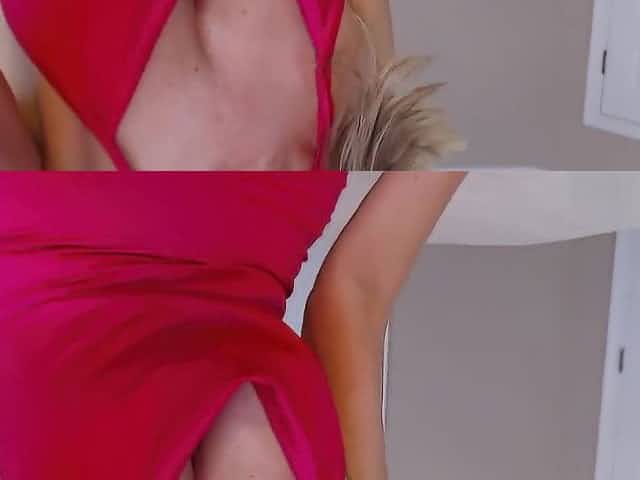 Golden haired stunner poses and masturbates in exotic pink pantyhose