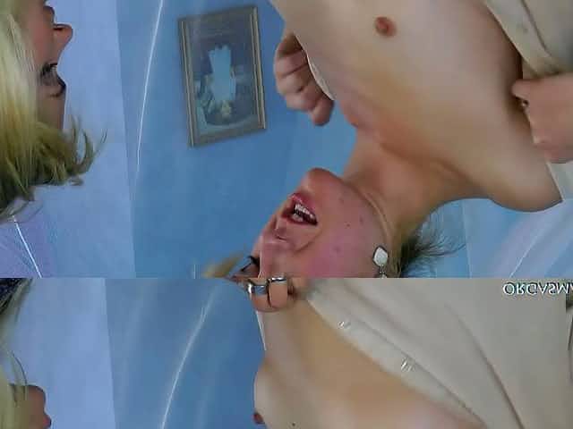 Two mesmerizing blond lesbians tickle each other's cunts with vibrator