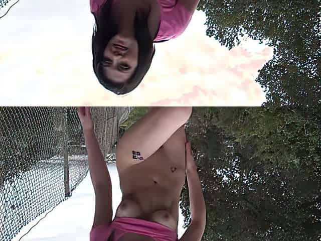 A slim girl plays with her pink pussy in a public park