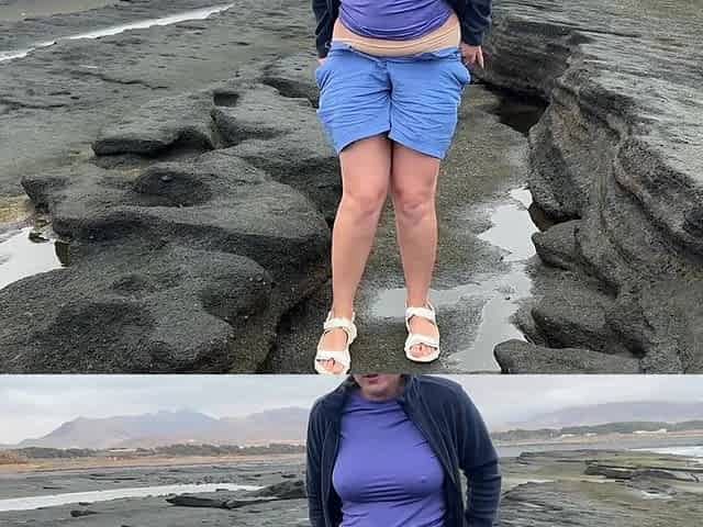 After banging all night on the beach, stepmom goes to pee and shows off her large curly vagina