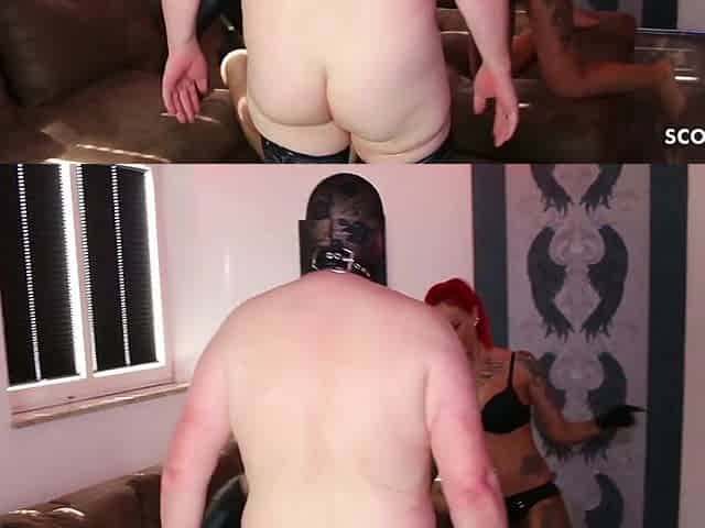 Lesbian Femdom Spanks And Strapon Fucks her slave