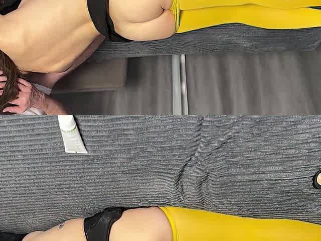 Lora does a massage and bangs her boyfriend in the butt with a thong-on. Pegging.