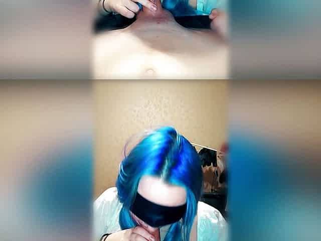 Blue haired emo teen with pigtails sucks big cock