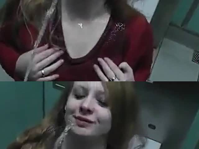 Rothaarige Freundin trinkt Urin in einer öffentlichen Toilette