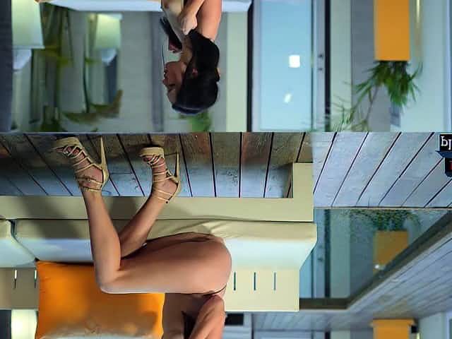 Long-haired young brunette Cathy is soloing with her firm tits, round ass, and shaved pussy in heels, stockings, & in her hot li
