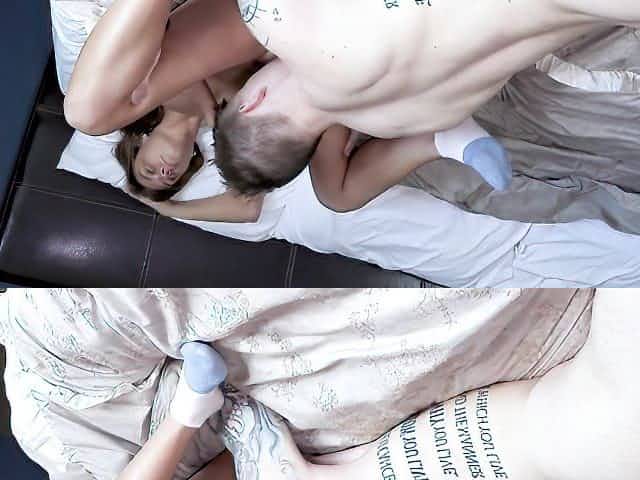 Skye Blue is playing with her step- brothers rock hard dick, to make him cum
