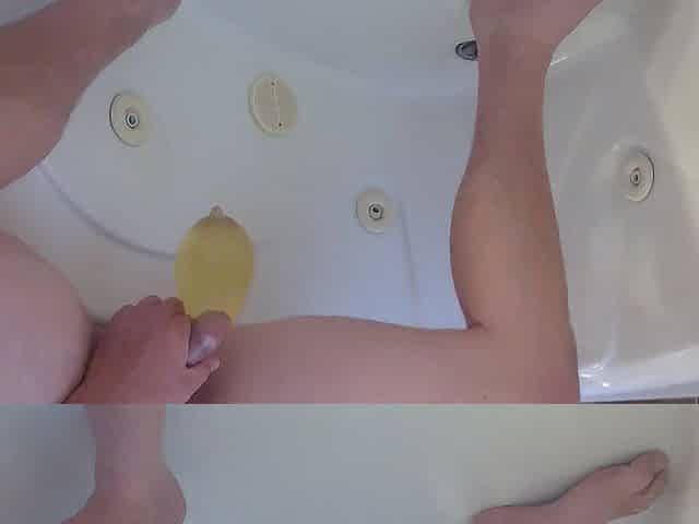 Pissing into a fuck-rubber in the bathtub