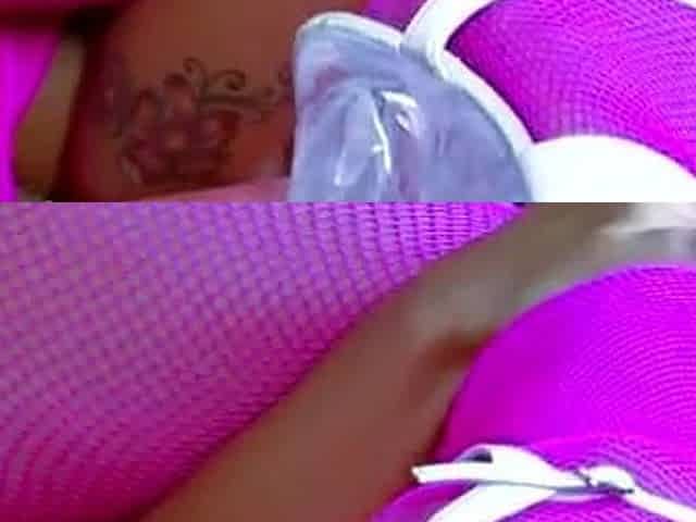 Tattooed babe in pink fishnets gets hard ass fuck
