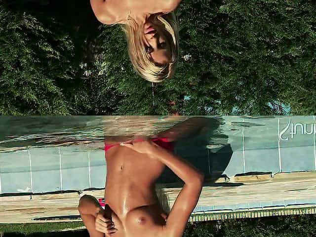 Oiled-up blonde with a great ass enjoying a hardcore fuck next to her swimming pool