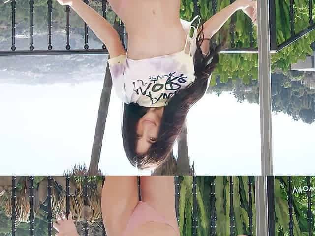 Flexible brunette Emily Pink nicely plays with her wet shaved pussy