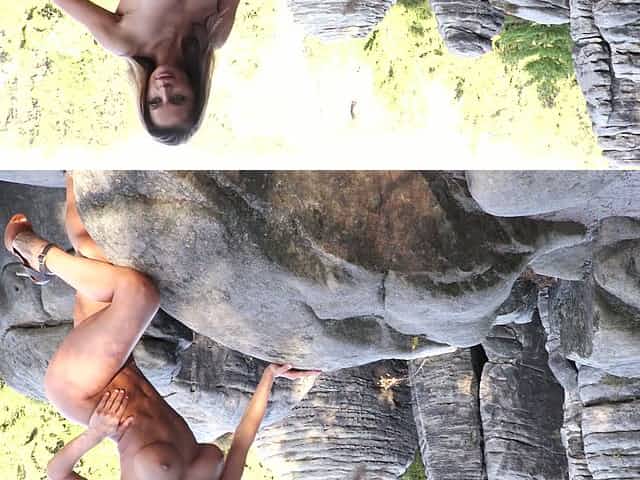 Mouth watering babe Dana Harem is posing on the rocks in the forest