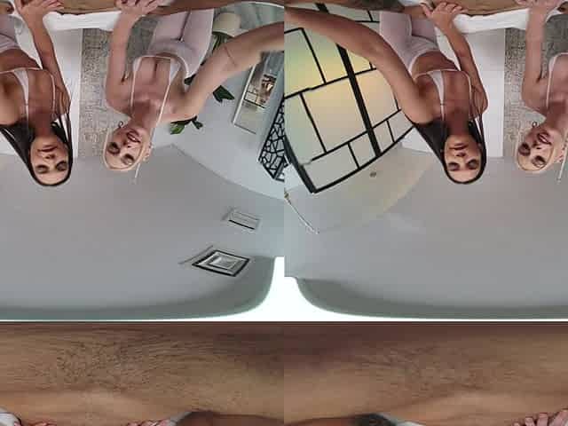 Homemade VR video with two sexy babes taking turns riding one dick