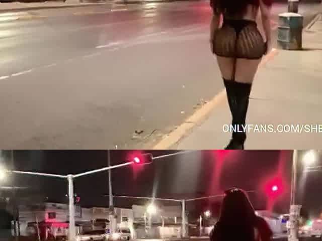 This Babe undresses stripped in public with red hose and heels