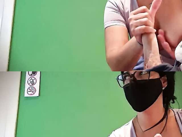 Masked babe with glasses strokes the big dick in a waiting room