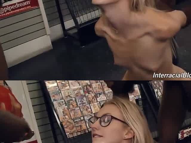 Big tit pornstar Whitney Stevens in an adult store giving the employes and chain fuck and suck