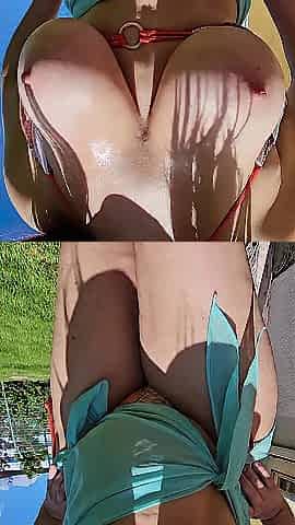 A teen with exposed tits flaunting her assets on the public beach