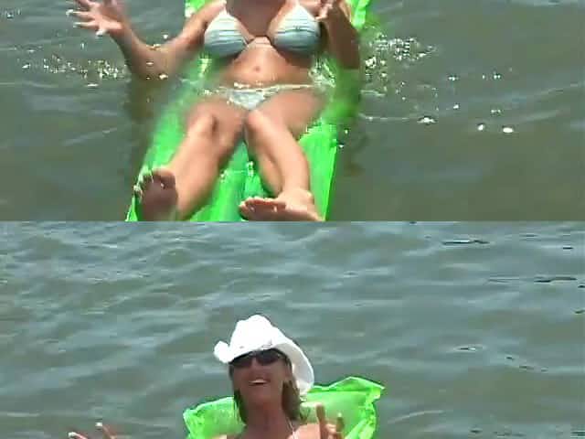 Blistering hot cowgirl in sexy bikini flashes her natural tits in wild yacht party