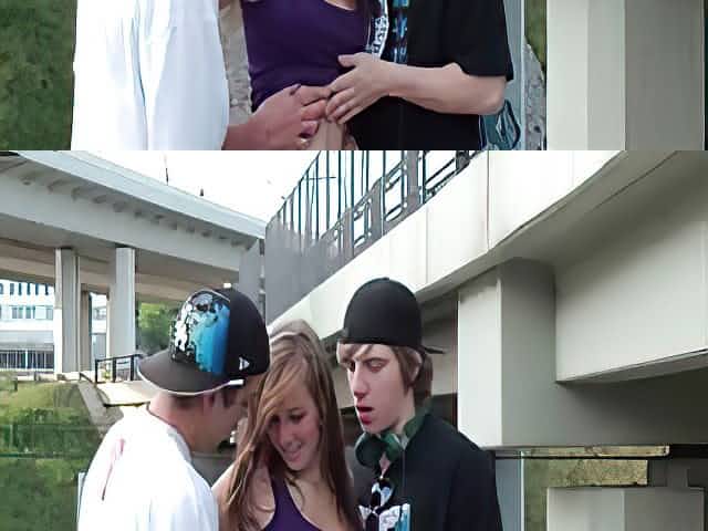 Public Gangbang Threesome Sex With A Cute Brunette Teen Girl