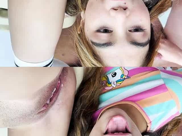 Facial cum on a blonde teen cute girl in public street gang bang threesome