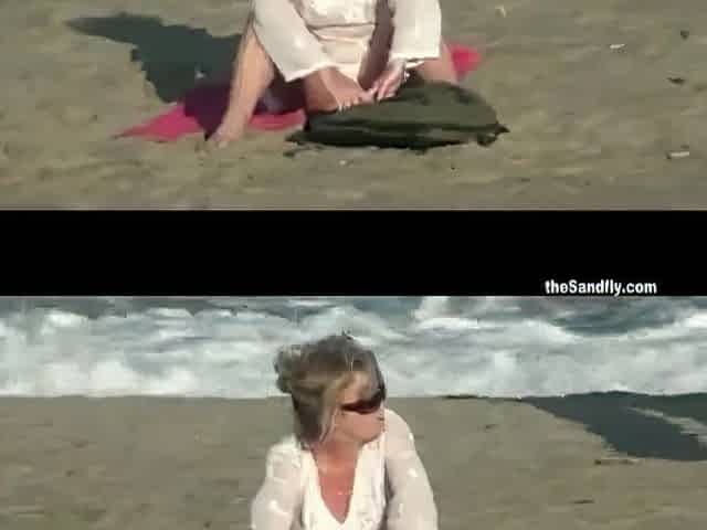 Hustrun ger ett strandhandjobb.