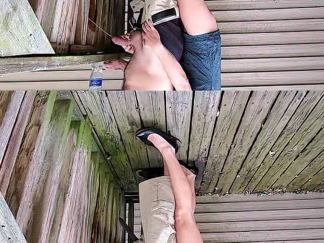 Holding my boyfriend's ramrod whilst this guy urinates off the deck - outside void urine - high heels - hot legs