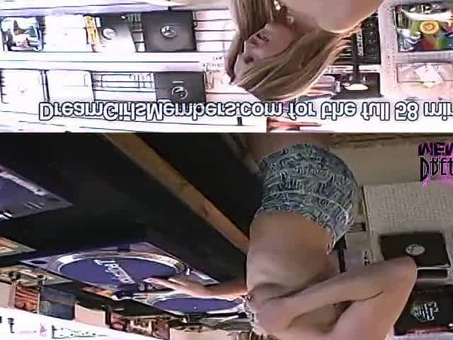Pierced blonde hottie strips naked in a record store