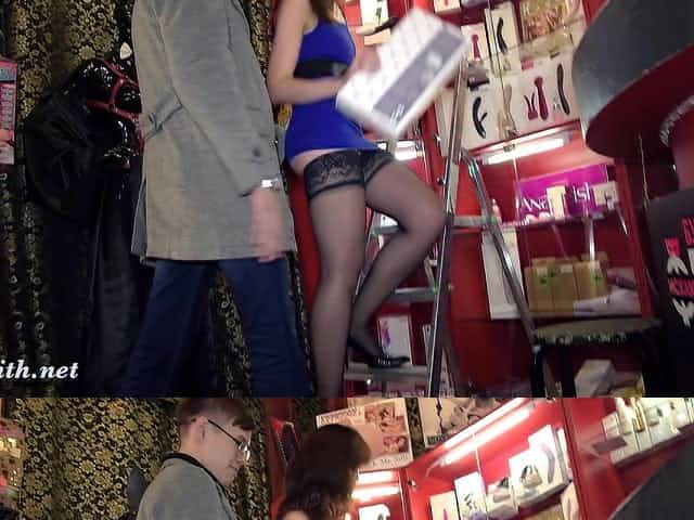 Naked sales girl meet customers in a sex shop