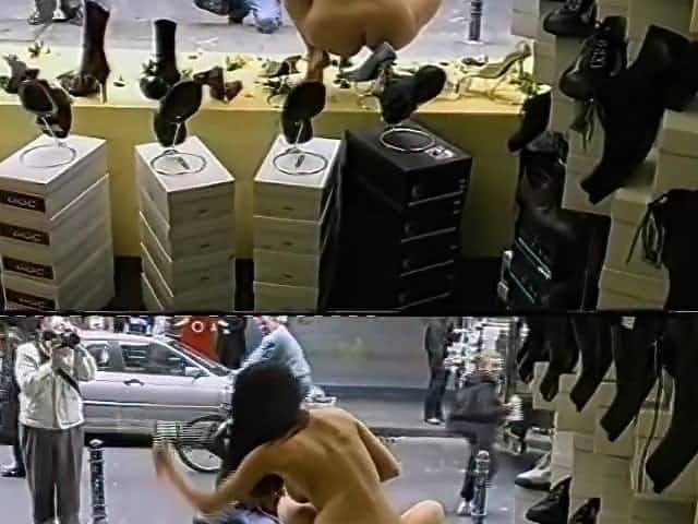 Nude girl washing windows in public