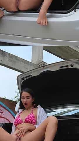 Huge Outdoor Pissing with Spread Legs in Car Trunk at Parking Lot