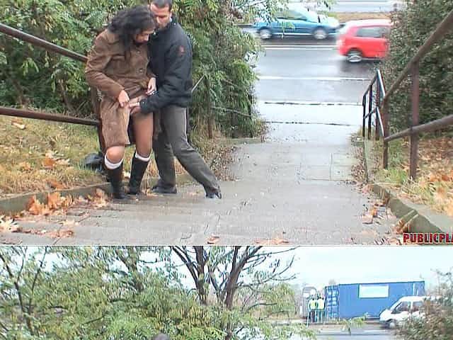 Slutty brunette in high heels drilled hard in public