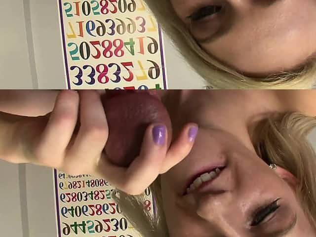 Cutie Carol grabs his cock and pumps it leaving a load on her tits