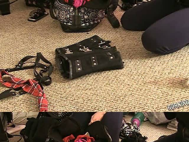 Brunette bimbo in wicked sexy punk outfit masturbating