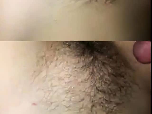 Jack off and cum on her hairy pussy