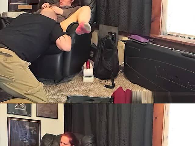 Dividing Stoney Lynn's pussy lips with his manhood on a sofa