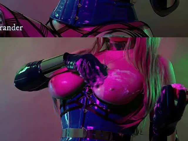 Latex hoe plays with a sex toy before facial