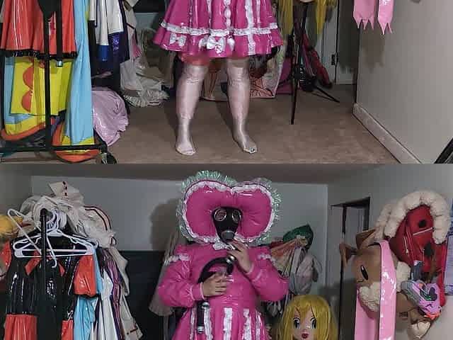 Pink PVC Sissy Bonnet Suit, Gasmask Pleasure with Breathing bag and Bubbler Bottle