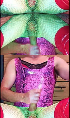 Massive cumshot - neon fishnets, PVC boots, latex dress