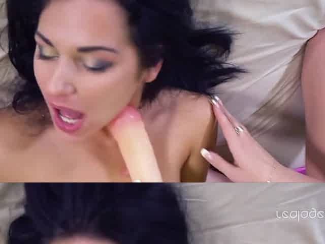 Big strapon dildo shaped like a real cock fucks a lesbian pussy