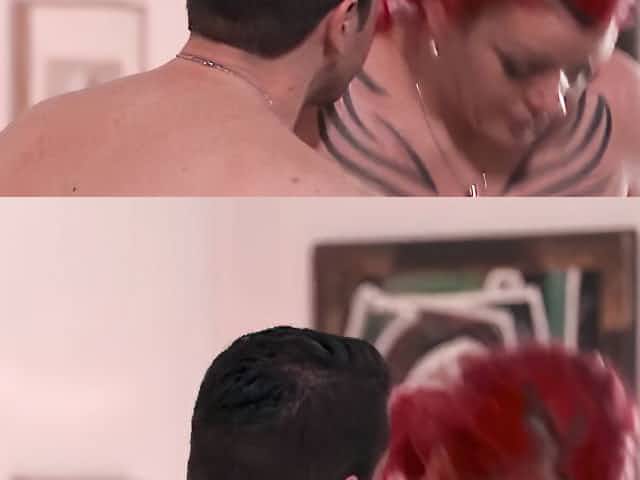 Slutty redhead is having an intense threeway sex with two inked blokes